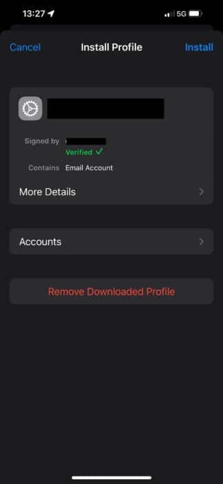 Bovenaan de instellingen ziet u Profiel gedownload, klik erop en tik op installeren om de profielconfiguratie te downloaden