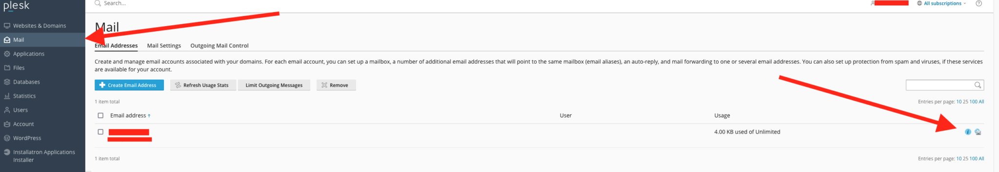 U moet eerst inloggen op Plesk, vanaf daar navigeert u naar e-mail en aan de rechterkant van uw e-mailadres staat een pictogram, klik erop.