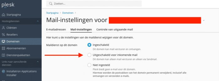 Om de procedure te voltooien, hoef je alleen nog de Plesk-maildienst uit te schakelen. Ga naar het tabblad ‘Mail’ op de hoofdpagina van het domein, navigeer naar de Mail-instellingen en zet bij ‘Maildienst op dit domein’ ‘Uitgeschakeld voor inkomende mail’.