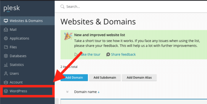 Eenmaal in Plesk navigeer je naar de linkerkant van je scherm en klik je op WordPress.