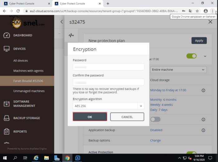 Om Encryption aan te zetten, voer hier je wachtwoord in en kies de Encryption Algorithm. Klik vervolgens op OK