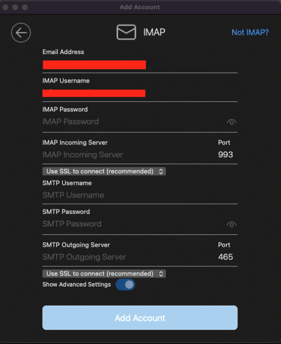 Nu krijg je een pop up om het handmatig in te stellen, je zou een paar opties krijgen waar je uit kan kiezen, je moet IMAP kiezen.