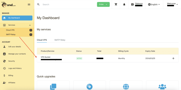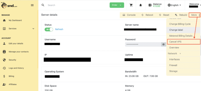 Although we are sad to see you go, we are happy to be of service once more before you cancel. If you have done this action by accident, please contact the support so we could remove the cancel request on time before your server gets terminated. Notice also that your server or other services if not renewed on time will be canceled and in that case you should check for any unpaid due invoices in the client area under the tab “Billing“. In the following we will show you how to manually cancel a service at Snel.com.