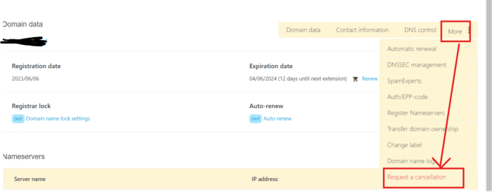 After selecting the domain you wish to cancel, proceed by clicking on the “More” button on the right side. You will now see a dropdown menu, where you can then select “Request a Cancelation”.