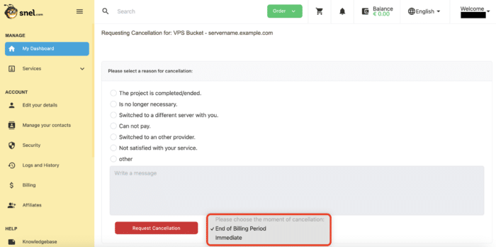 You are now in the cancellation section. Here, you have two options regarding the termination of the service. You can choose to terminate the services “Immediately” or wait until the “end of billing period” If you opt for “Immediate” termination, we will stop the service immediately. If you choose termination at the end of the billing period, the services will continue until after the last billing period.