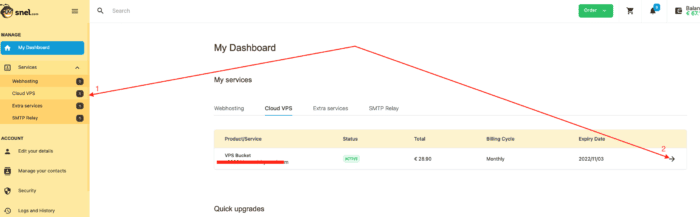 Once logged in to you snel.com account in your left sidebar click on Services and select your Cloud VPS instance you would like to reboot by clicking onto the name of the instance or the arrow on the right side.