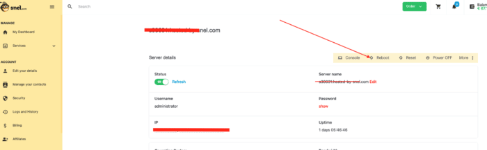 After you have selected the VPS instance it is pretty easy to spot the button “Reboot” on the right side under the server details.