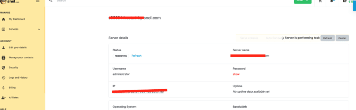 Now that you have clicked on the button the server will go into the reboot mode and in the dashboard you will see the server status change. Wait for the reboot to finish ( most of the time it takes couple of minutes) than click on the button refresh next to the server status. If it states “Active” it means that the server rebooted properly and that you can try to login into your server using the console and credentials provided.