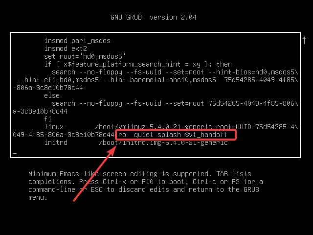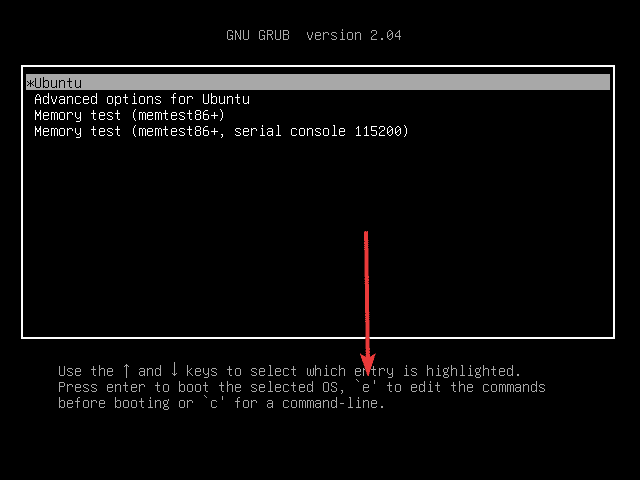 - In GRUB menu, press: E which wil make it possible to edit grub boot parameters.
