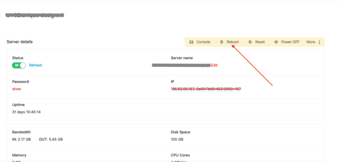 If you are using dedicated server go to > Server power control > Reboot . This wil reboot the server.