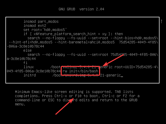 rw init=/bin/bashas shown in the below screenshot - Once done, press CTRL + X or F10 to boot in single-user mode.